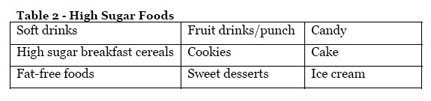 Carbohydrates are generally classified as sugars (simple), starches (complex) and fiber. Natural sugars (e.g., fructose or galactose) can be found in fruit and milk. Refined or added sugars originate from plant sources such as corn. A monosaccharide is a single sugar unit, such as glucose (commonly referred to as blood sugar), fructose (fruit sugar) and galactose. Disaccharides include sucrose (table sugar), lactose (milk sugar) and maltose. Refined or added sugar (Table 1 and Table 2) is often found in soft drinks, candy and sweet desserts. Most Americans consume adequate amounts of sugar each day. However, consuming foods high in refined or added sugars can lead to excess calorie consumption, particularly when the food is also high in fat and calories. Therefore, try to limit these foods and select more natural sugars found in fruits, vegetables and low-fat dairy. Ideally, added sugars should be limited to no more than ten percent of total daily calories. [1]